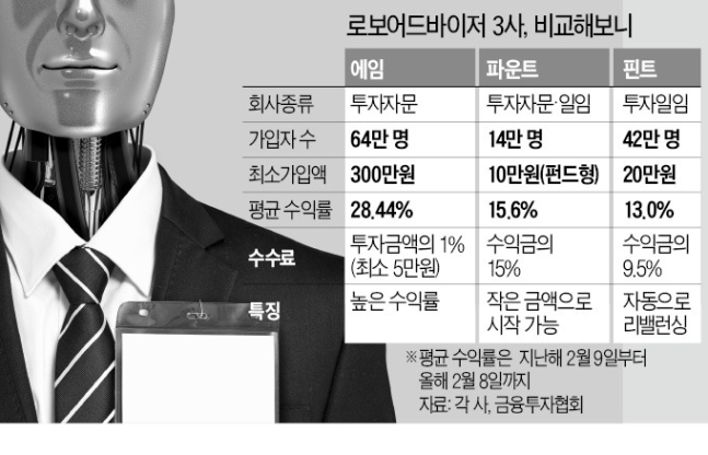 핀테크 로보어드바이저는 은행 증권사가 아니라 앱을 통해 자산관리를 받는 서비스다. 에임, 파운트, 핀트 등이 대표적이다. 연결계좌를 개설해 금액을 넣어놓으면 AI가 투자자의 성향에 맞는 자산 배분·상품 설계 등을 추천해주거나 돈을 직접 굴려준다.