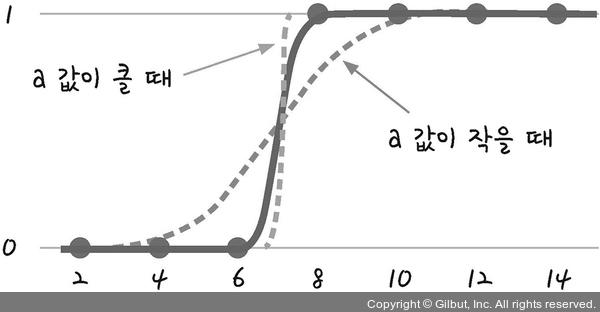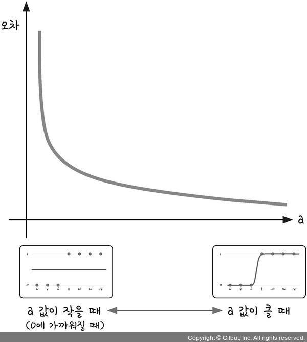a 값이 작을 때는 0 또는 1의 값을 아예 나타내지 않는 직선이 된다. 따라서 오차가 무한대로 증가한다.