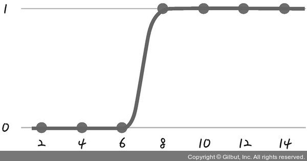 1과 0 사이의 값이 없으므로 직선으로 그리기 어렵다. 따라서 아래와 같이 S자 형태로 그려진다.