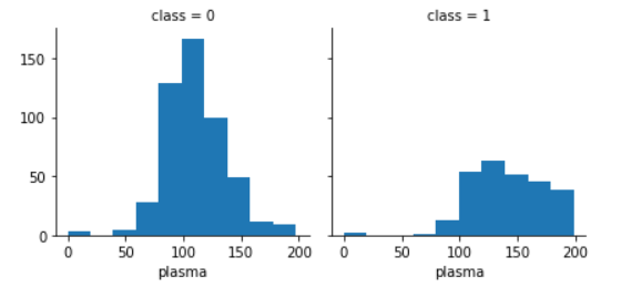 당뇨병 환자(class = 1)를 보면 plasma 수치가 150 이상인 경우가 많다는 것을 알 수 있음