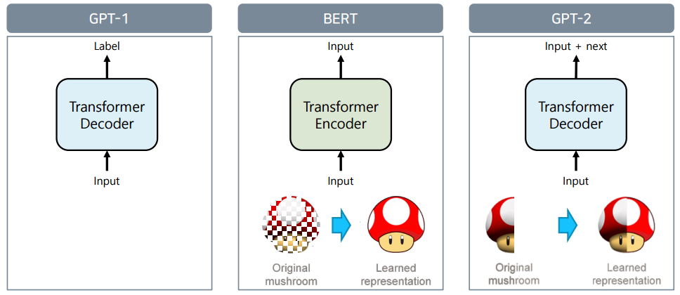 - BERT는 mask된 자연어를 원본 자연어로 복원하는 과정으로 학습