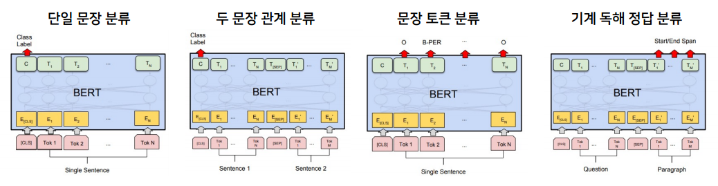 - 단일 문장 분류(어떤 클래스인지), 두 문장 관계 분류(next sentence, 가설, 유사도 등), 문장 토큰 분류(각 토큰들의 output에 classifier 부착 -> 토큰이 어떤 레이블을 갖는지 분류. 객체명 인식기), 기계 독해 정답 분류(문서 내 정답 찾기)
