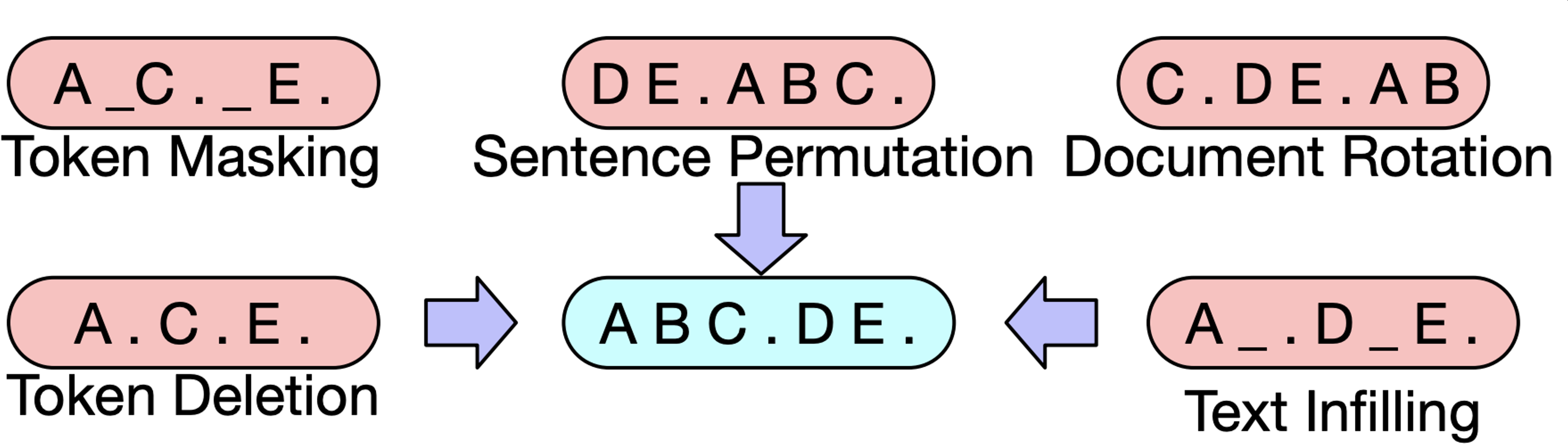 - 기계 독해, 기계 번역, 요약, 대화 등 sequence to sequence 문제의 pre-training을 위한 denoising autoencoder (노이즈 injection 후 노이즈 없었던 원래 버전을 reconstructor하는 문제)