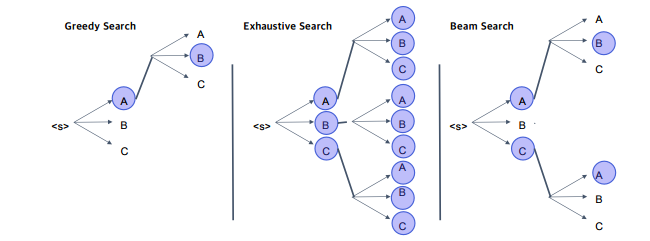- Greedy search : 속도 빠름, decision making을 early stage에서 해 최종적으로 안좋은 결과가 나올 수 있음