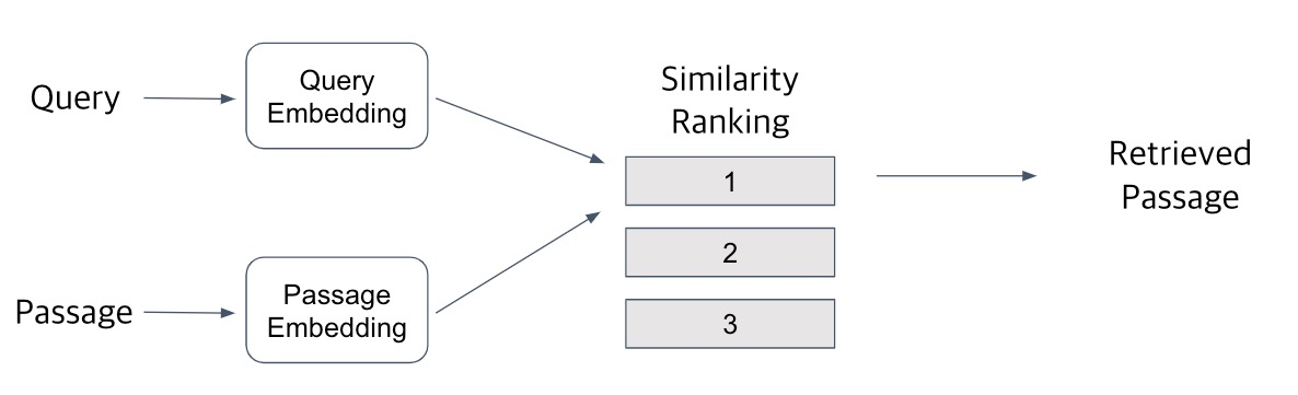 - Query와 Passage를 임베딩한 뒤 유사도로 랭킹을 매기고, 유사도가 가장 높은 Passage를 선택함