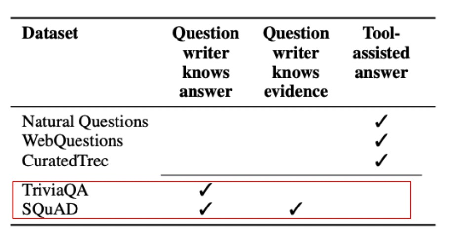 : 질문을 하는 사람이 답을 알고있기 때문에, paraphrasing 되지않고 질문과 evidence 문단 사이의 많은 단어가 겹치는 bias가 발생 가능하다