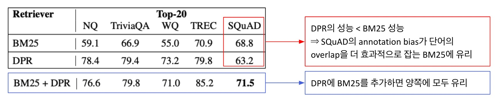 (BM25 : Sparse embedding / DPR : dense embedding)